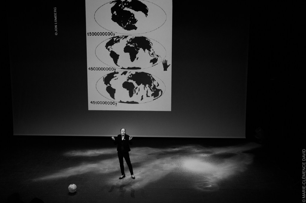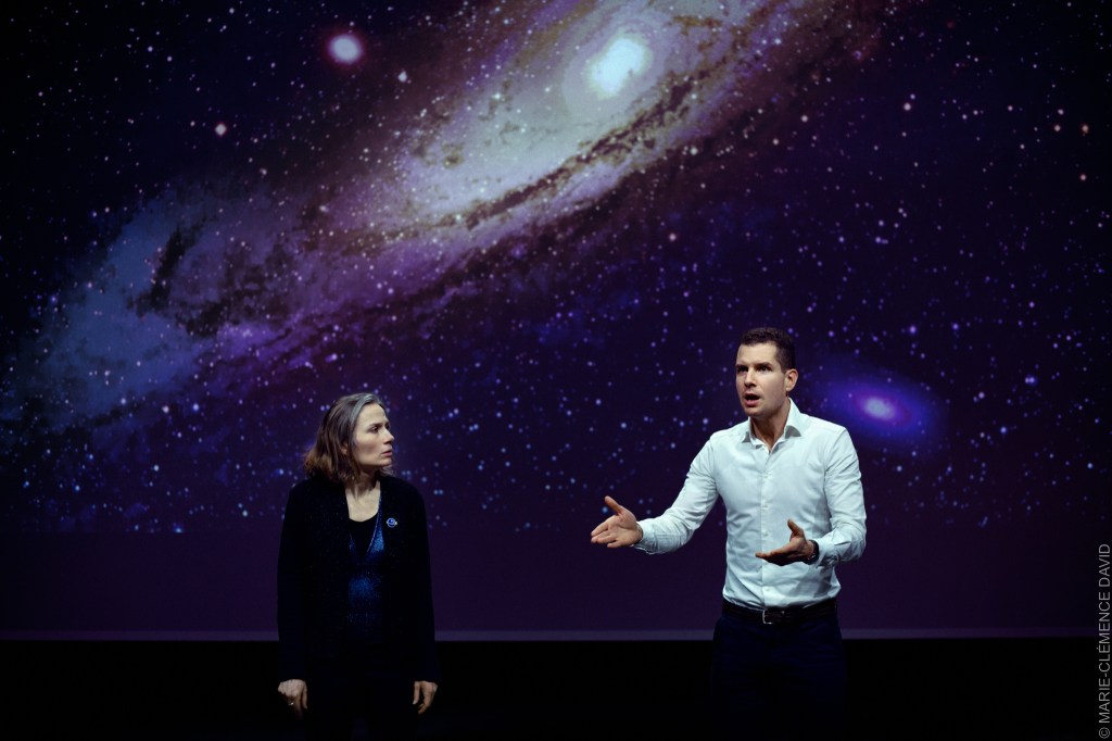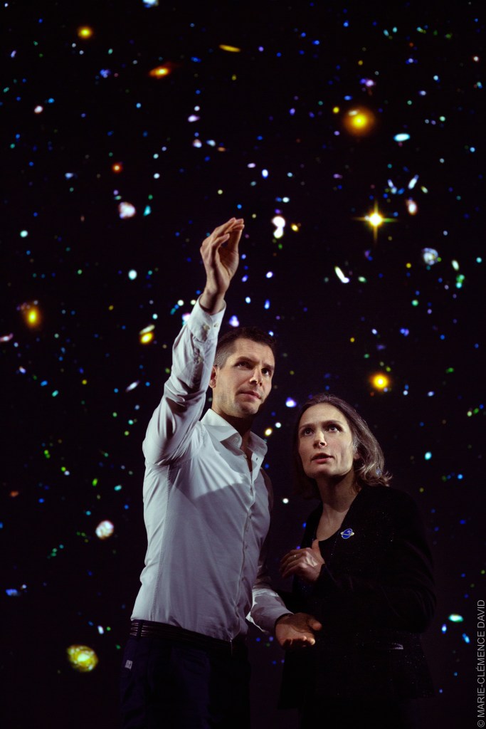 Quand Pascal écrivait « Le silence éternel de ces espaces infinis m’effraie », il établissait déjà un rapport entre l’incommensurabilité de l’univers et la vanité de la condition humaine. L’expérimentation en cours sur le plateau amène la communauté théâtrale, acteurs et spectateurs réunis, durant une représentation d’une heure quinze environ, à s’interroger sur sa condition d’être terrestre, en tant que matière organique issue du Big Bang, et à se repenser dans cette vertigineuse cosmogonie.